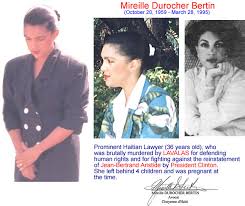 Le 28 Mars 1994 Mireille Durocher Bertin etait assassine par des officiels et des sbires au service du gouvernement Haitien. Selon les informations qui circulent les ordres pour l'execution de Me. Bertin venait directement du President constitutionnel de la republique Jean Bertrand Aristide. C'etait une execution brutale. Cette avocate mere de 4 enfants en bas age fut tuee par quinze balles. Eugene Junior Ballairgeau qui etait aussi dans le vehicle crible de balles perdait aussi la vie.